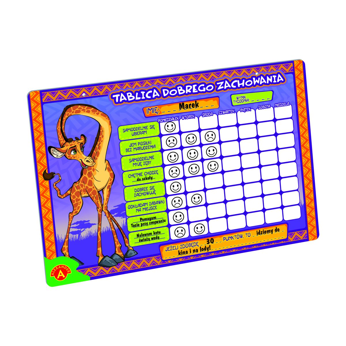 \"Tablica dobrego zachowania\" to doskonała pomoc wychowawcza. Używanie tablicy najlepiej rozpocząć od poniedziałku. Dzień wcześniej należy wspólnie, razem z dzieckiem, uzupełnić pola tablicy. W polach tabeli dorosły będzie codziennie wieczorem zaznaczał zachowanie dziecka dotyczące zapisanych zadań. Dziecko i dorosły ustalają wcześniej jakiego pozytywnego i negatywnego symbolu będą używać. Za każde wykonanie zadania w białe pole wpisywany jest pozytywny znaczek. Każdy pozytywny znaczek to jeden zdobyty punkt. Za niewykonanie zadania w białe pole wpisywany jest negatywny znaczek. Za negatywne znaczki nie otrzymuje się punktu. Dziecko i dorosły ustalają ile punktów powinno zdobyć dziecko w ciągu tygodnia, aby otrzymać wybraną przez siebie nagrodę. Następnie wpisują ustalenia w małą tabelkę \\\\\\\"nagroda\\\\\\\". Po całym tygodniu uzupełniania tabelki, dorosły i dziecko zliczają ilość pozytywnych symboli i wpisują sumę punktów okienko pod spodem tabelki. Jeżeli dziecko zdobyło ustalona liczbę punktów to dostaje wcześniej ustaloną nagrodę. Zawartość pudełka: tablica, mazak, gąbka i sznurek.