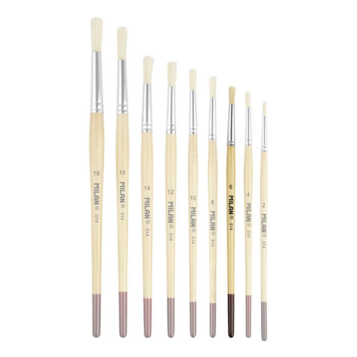 Okrągły pędzel serii 514 nr 6 ze szczeciny Chungking o wysokiej odporności i trwałości. Nadaje się kleju, lakierów, tempery i gęstej farby. ergonomiczny krótki drewniany trzonek polakierowany w kolorze naturalnego drewna sosnowego. Aluminiowa skuwka, odporna na rdzewienie. Idealne do użytku szkolnego. Średnica włosia: 4,6 mm. Długość włosia: 14,3 mm. Długość pędzla: 185 mm.