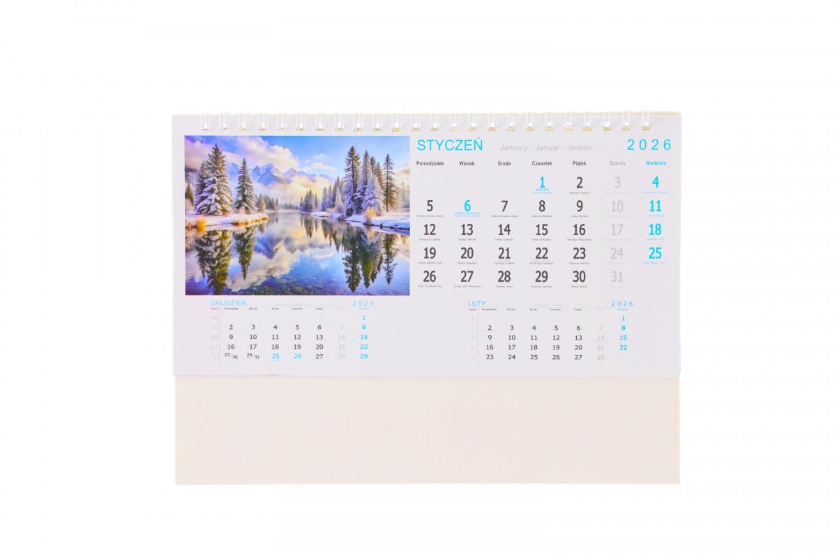 KALENDARZ BIURKOWY poziomy lux 115-x225 – druk dwukolorowy, 3-języczne kalendarium, wschody i zachody słońca, fazy księżyca, święta narodowe i kościelne. Podstawka wykonana z kartonu 900 g oklejona materiałam skóropodobnym , oprawa spiralowana. 80 kartek