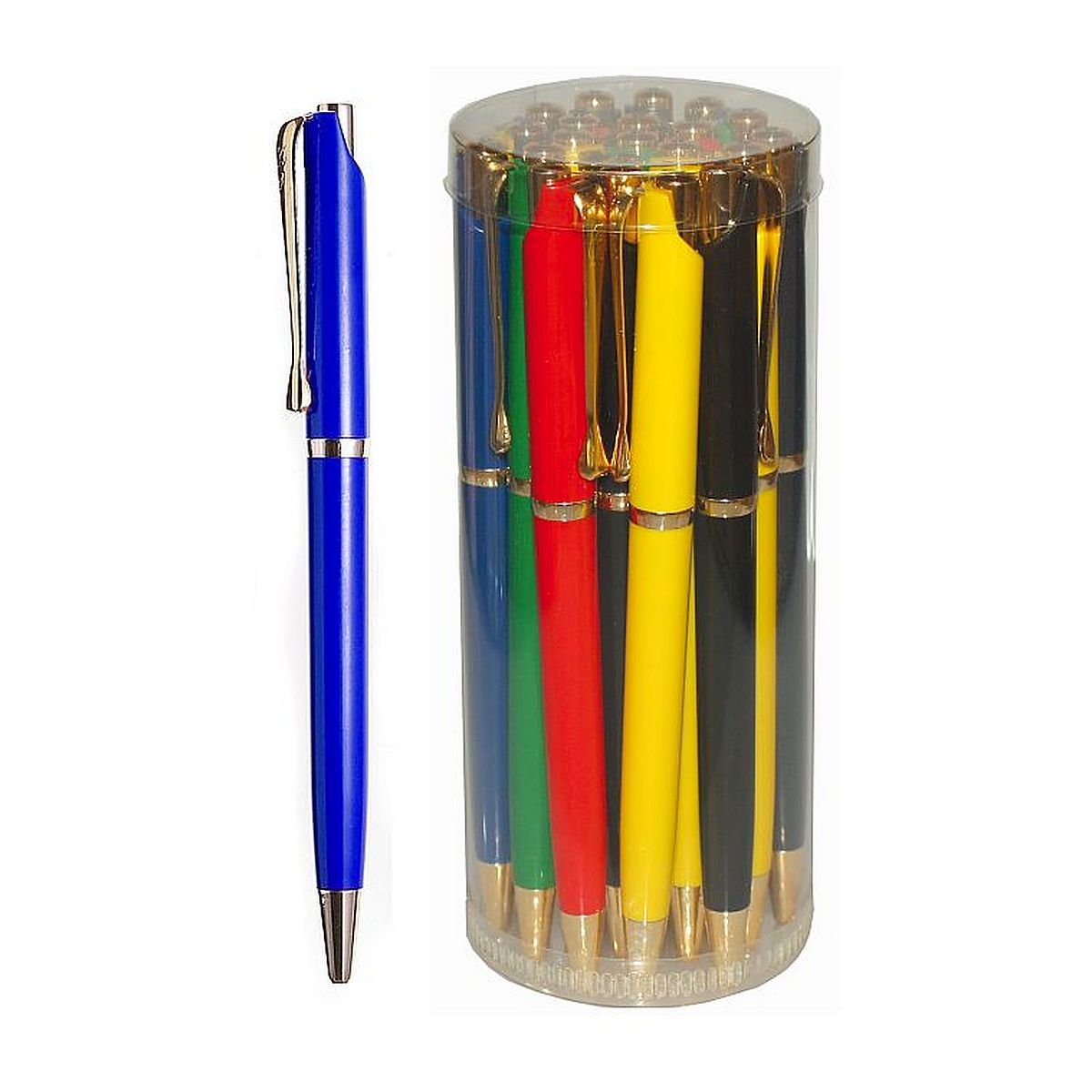 długopis automatyczny, złocone wykończenia, przycisk zabezpieczony przed przypadkowym wciskaniem, wkład niebieski 1 mm, tuba 20 szt. w różnych kolorach, produkcja : Segno, Włochy