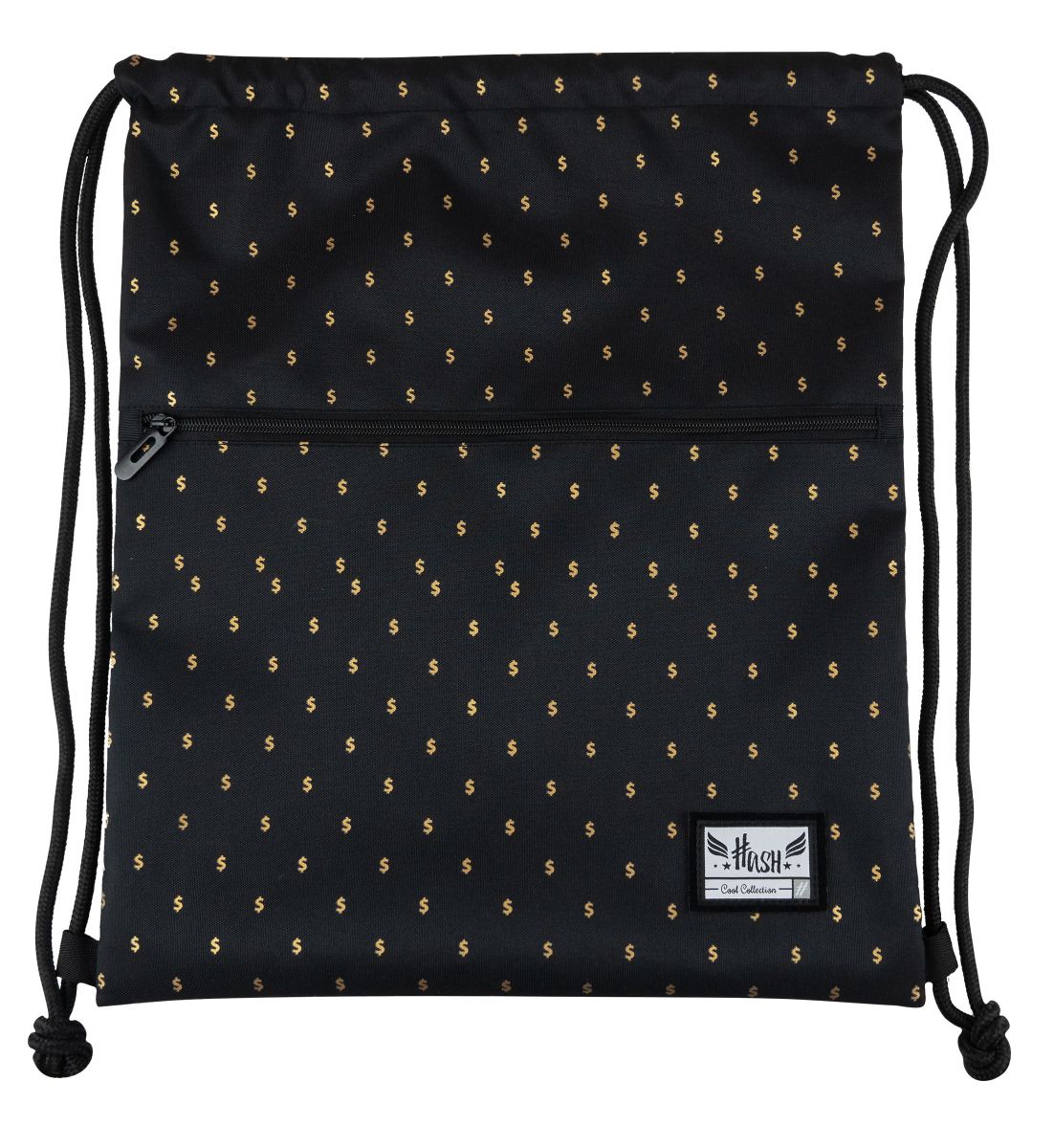 Uwielbiasz styl bling-bling? Wybierz ultranowoczesny worek na plecy od Hash. Modny motyw złotych dolarów na czarnym tle jest elegancki a jednocześnie wyróżnia się z tłumu. Dzięki grubemu i przyjemnemu w dotyku sznurkowi możesz śmiało korzystać z tego worka jako alternatywy do ciężkiego plecaka. Sprawdzi się on zarówno podczas treningu, jak i na koncercie!