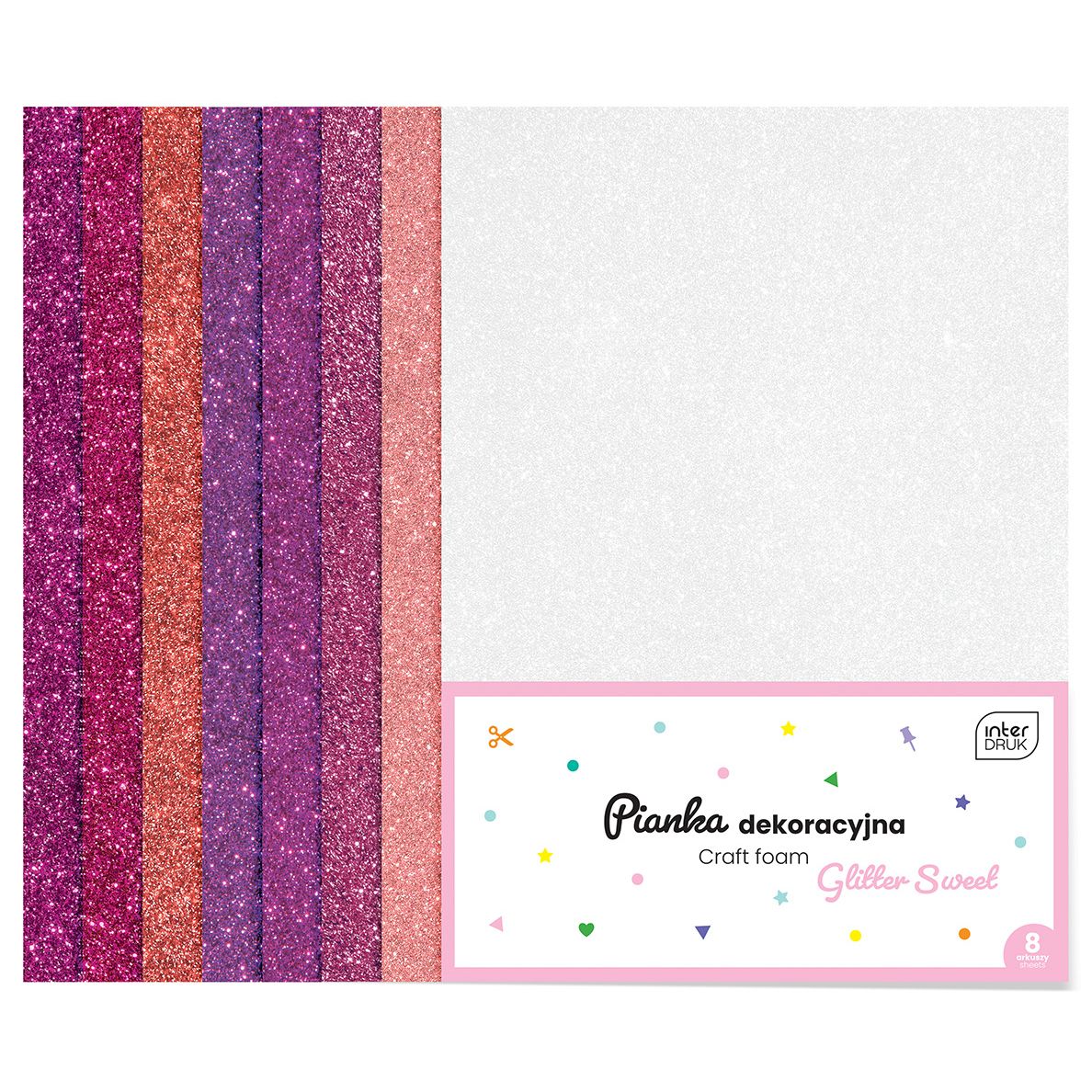 Opakowanie zawiera 8 arkuszy pianek w rozmiarze A4 w odcieniach różu i fioletu, jednostronnie pokrytych brokatem.