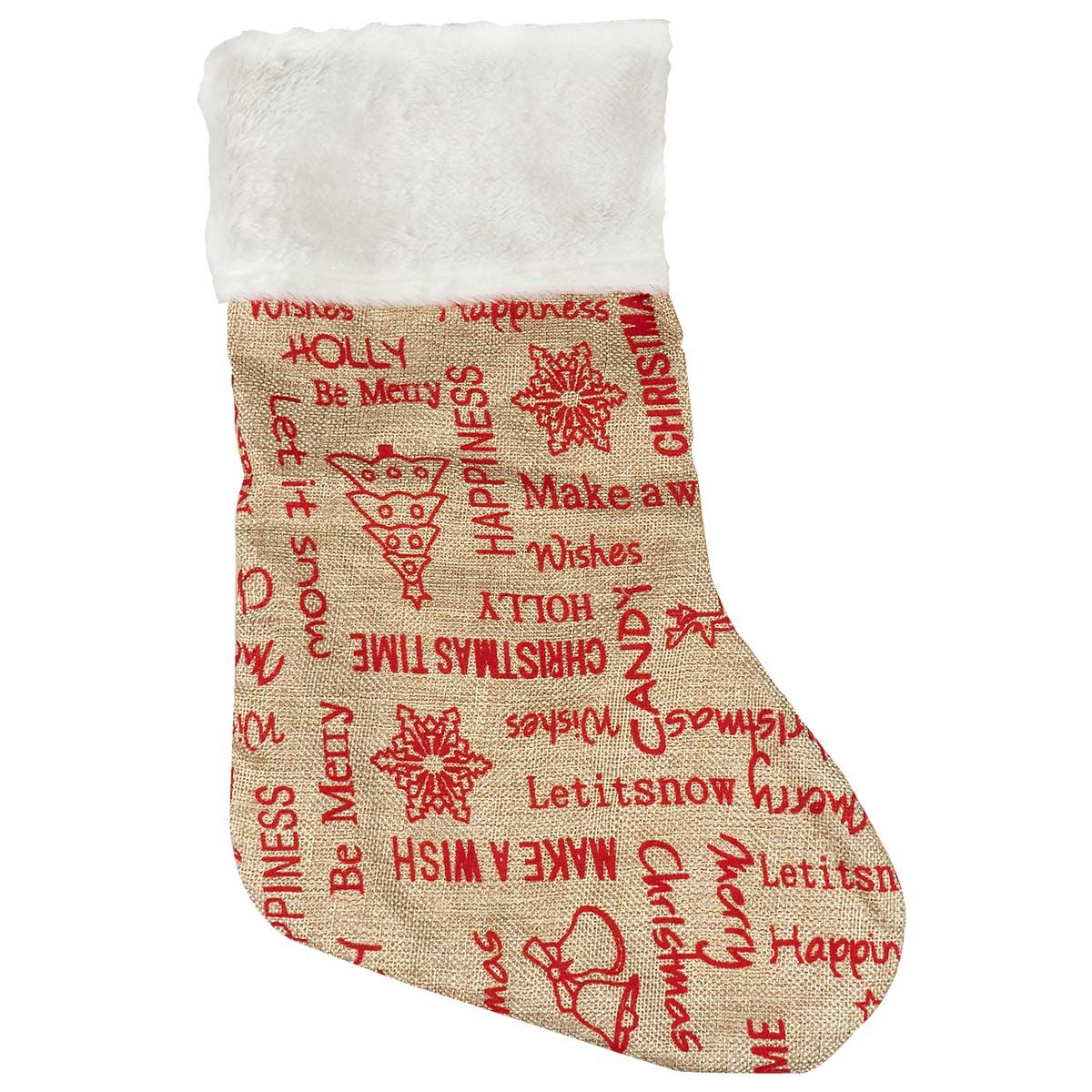 Duża skarpeta świąteczna wykonana z materiału jutowego. Góra skarpety została obszyta białym, miękkim pluszem. Skarpeta w kolorze naturalnym z nadrukiem motywów świątecznych. Wymiar skarpety to 40 cm.