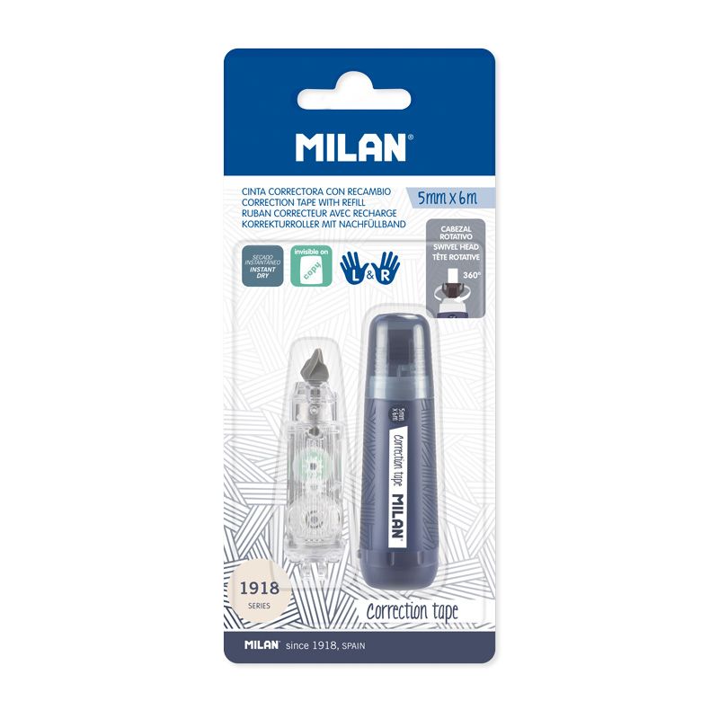 Korektor mini w taśmie nawiązujący kolorystyką do kolekcji 1918. Cylindryczny, posiada skuwkę zabezpieczającą. Odpowiedni dla osób leworęcznych dzięki obrotowej końcówce. Rozmiar taśmy: szerokość 5 mm x długość 6 m. Szybki, czysty i dokładny. Korekty na wszystkich rodzajach papieru. Nie pozostawiają śladów na kserokopiach. Kolekcja 1918 jest inspirowana oryginalnymi kolorami i wzornictwem gumek MILAN. Blister zawiera 1 korektor w kolorze granatowym + 1 zapasową taśmę korekcyjną na wymianę. Rozmiar korektora: 7,7 x Ø 2,2 cm.