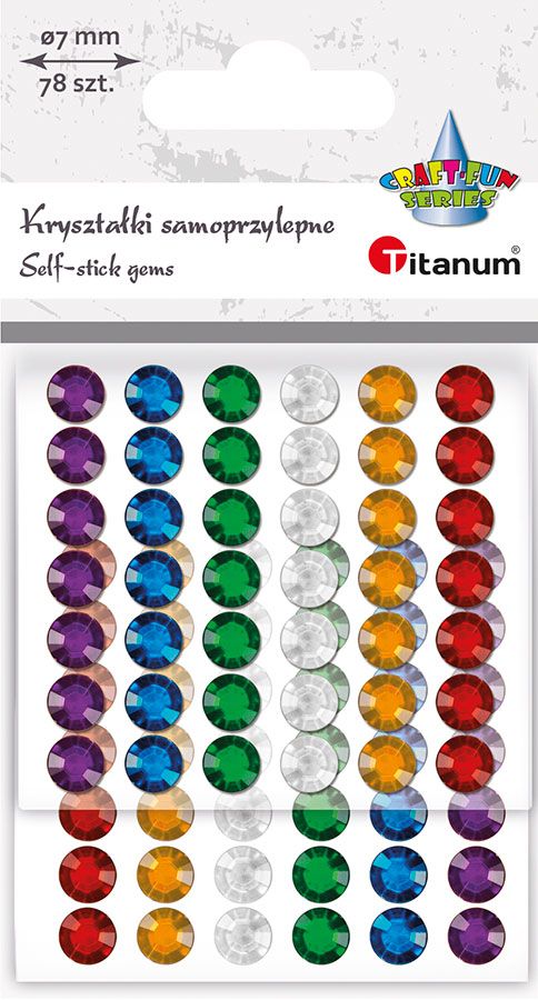 Kryształki samoprzylepne, wzór: okrągłe, średnica: 7 mm, kolory: fioletowy, chabrowy, zielony, srebrny, złoty, czerwony. 78 sztuk.