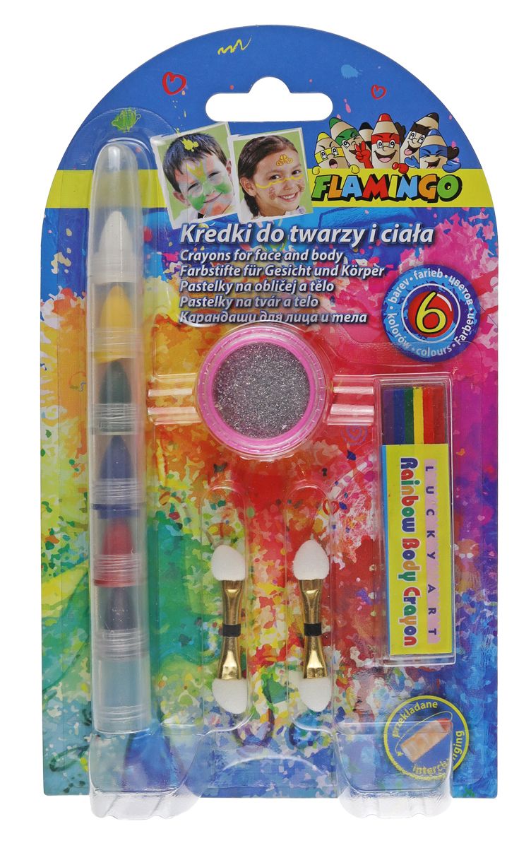 Zestaw 6 przekładanych kredek przeznaczonych do makijażu twarzy i ciała. Łatwe w użyciu i przechowywaniu. Plastikowa obudowa chroni dłonie przed zabrudzeniem i umożliwia zachowanie czystości w miejscu pracy. Bezpieczne – nie podrażniają skóry. Przed przystąpieniem do malowania: 1. Wypróbuj farby na wewnętrznej stronie ręki (upewnij się, że nie masz alergii na którykolwiek ze składników). 2. Zepnij włosy lub nałóż opaskę tak, aby włosy nie przeszkadzały Ci w pracy. 3. Twoja skóra powinna być czysta i sucha. 4. Zaplanuj malowanie motywów pamiętając, że nakładanie kolejnych farb zmieni ich barwę. 5. Nie nakładaj kredek na skaleczone lub podrażnione miejsca. 6. Ostrożnie nakładaj kredki w okolicach oczu, tak by siędo nich nie dostały. Usuwanie: Kredki usuwaj z ciała kosmetykami do demakijażu.