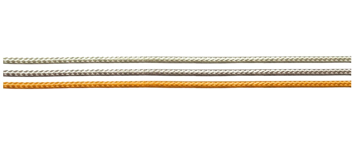 Sznurki poliestrowe, szerokość 1 mm, długość 3 m, 3 kolory: biały, srebrny, złoty.