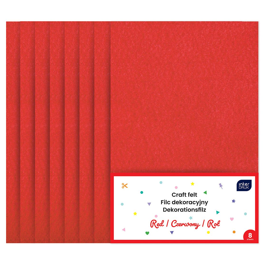 Opakowanie zawiera 8 arkuszy filców w rozmiarze A4 w czerwonym kolorze.