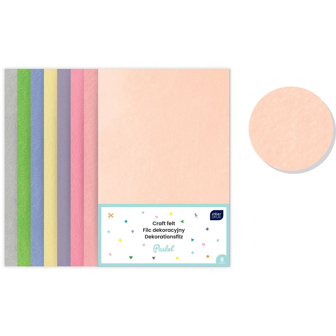 Opakowanie zawiera 8 arkuszy filców w rozmiarze A4 w pastelowych kolorach.