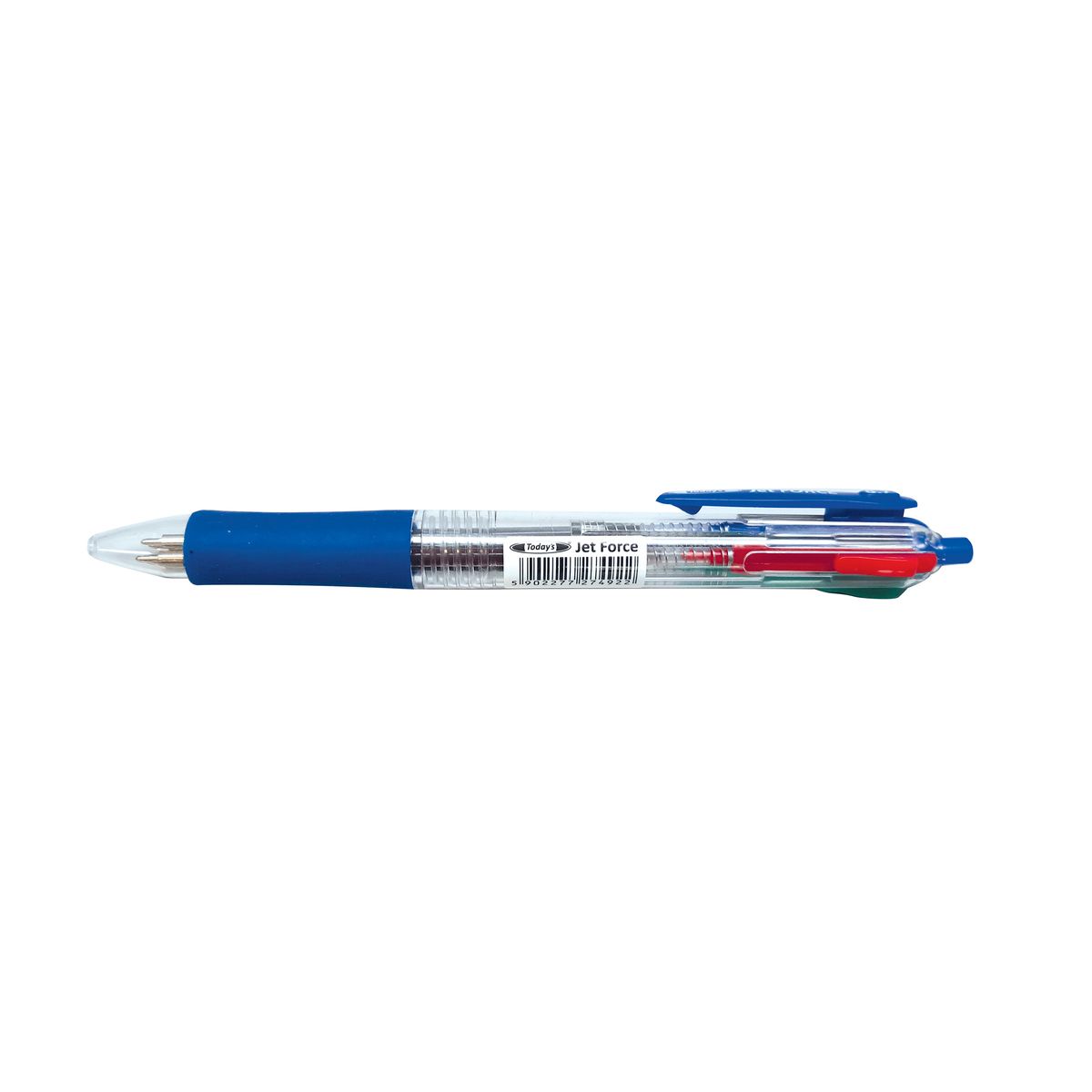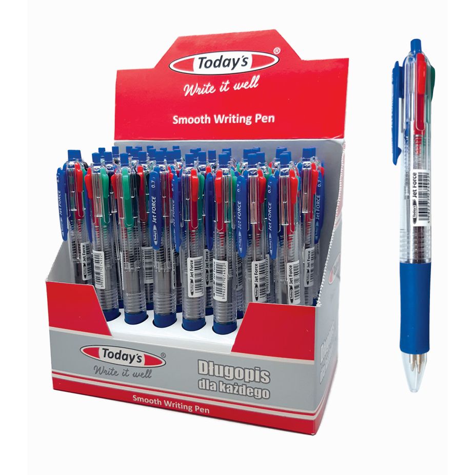 Długopis 4w1. 4 kolorowe wkłady olejowe: czarny, niebieski, czerwony i zielony. Igłowa końcówka. Wygodny gumowy uchwyt. Grubość linii pisania: 0.7 mm. 40 szt. w displayu.