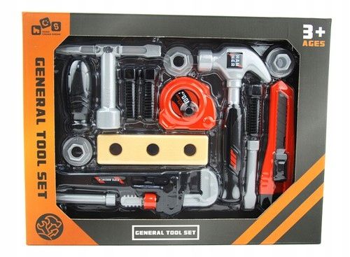 W zestawie między innymi: młotek, śrubokręt, klucze, śrubki, nakrętki, miarka, nóż budowlany.