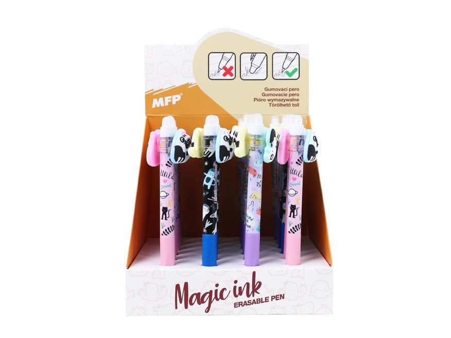 Działa na podobnej zasadzie, jak nasz długopis Wizard ze specjalnym, reagującym na zmiany temperatury tuszem, tzw. napisz – wymaż – popraw. W przypadku popełnienia błędu wystarczy jedynie odwrócić pióro i wymazać tekst silikonową końcówką. Wzrost temperatury spowoduje, że napis zniknie i możliwe będzie skorygowanie pomyłki. Długopisem można również pisać tajne wiadomości, które po wymazaniu i włożeniu kartki do lodówki da się ponownie odczytać.