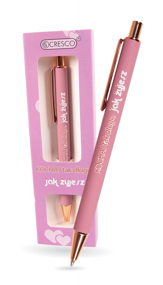 Długopis automatyczny z wymiennym wkładem 1mm. Kobieca kolorystyka, softowy, pastelowy korpus ze wykończeniami w odcieniach różowego złota. Nadruk na długopisie i pudełeczku to „Kochaj tak długo, jak żyjesz”. Dodatkowo wzbogacony nadruk o wyjątkową grafikę. Długopis zapakowany w prezentowe etui GB, w sam raz na upominek dla NIEJ.