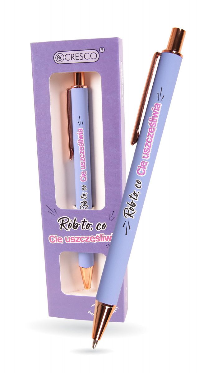 Długopis automatyczny z wymiennym wkładem 1mm. Kobieca kolorystyka, softowy, pastelowy korpus ze wykończeniami w odcieniach różowego złota. Nadruk na długopisie i pudełeczku to „Rób to, co Cię uszczęśliwia”. Dodatkowo wzbogacony nadruk o wyjątkową grafikę. Długopis zapakowany w prezentowe etui GB, w sam raz na upominek dla NIEJ.