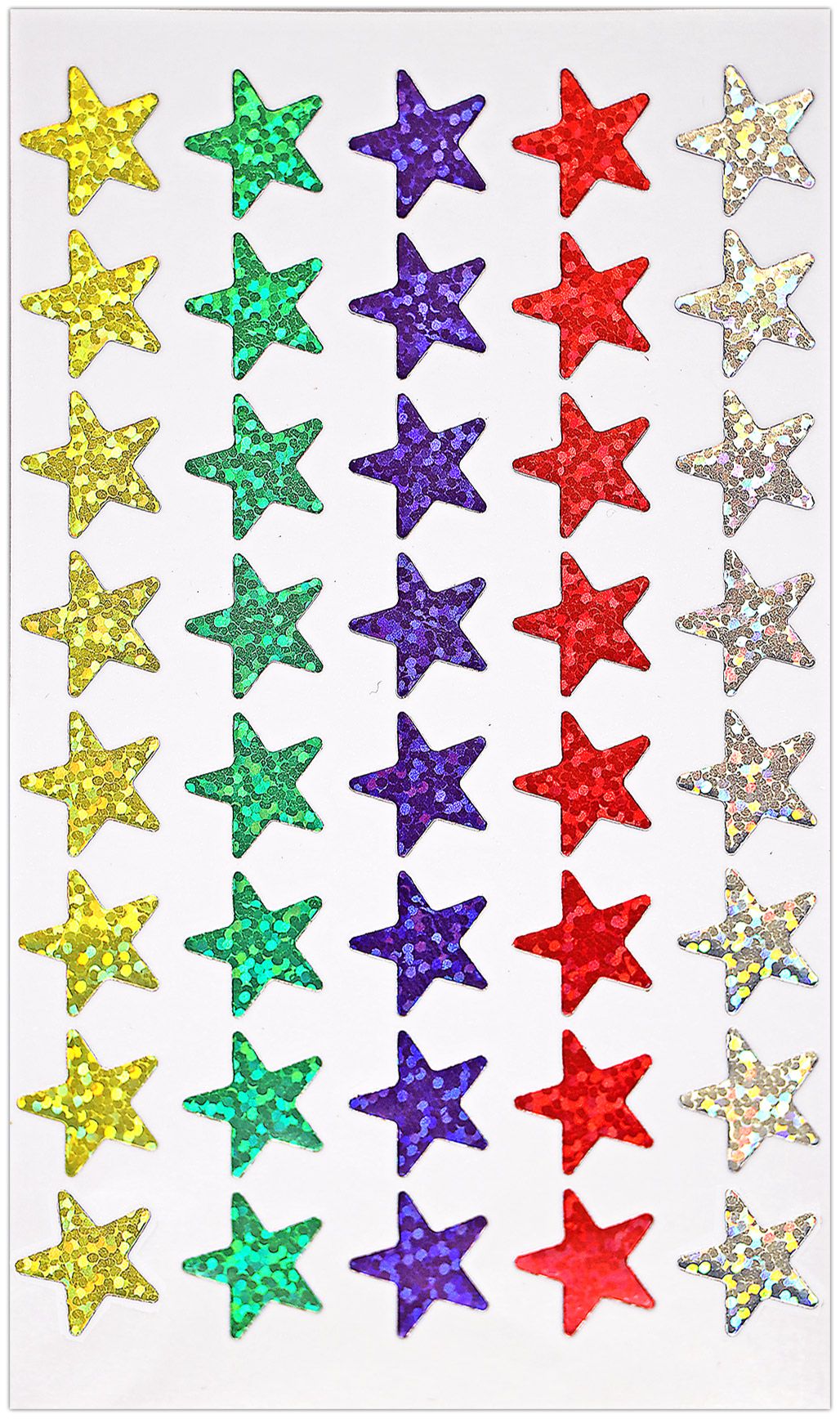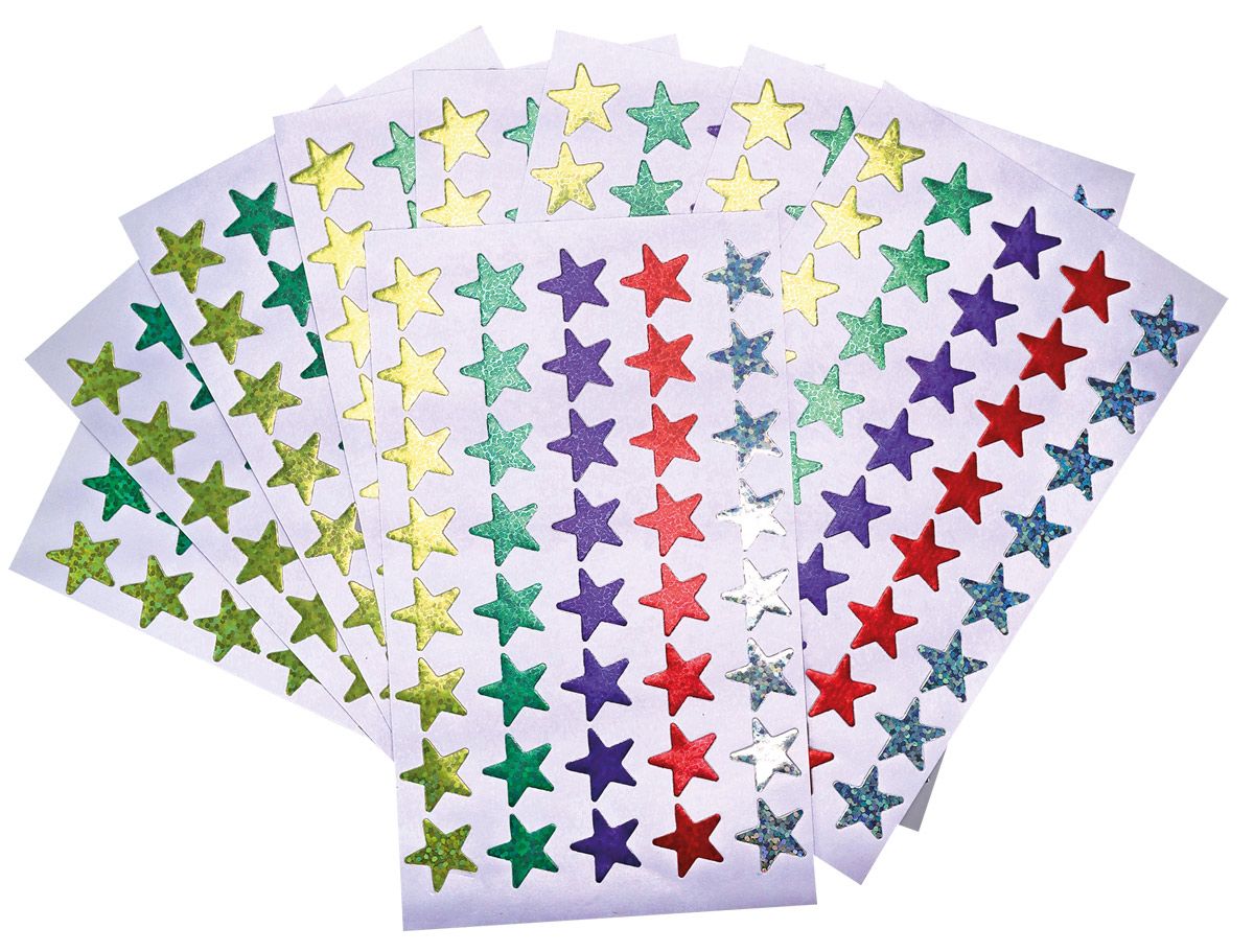 Naklejki foliowe, 10 plansz, wzór: gwiazdki, 5 kolorów na planszy, błyszczące. 400 sztuk.