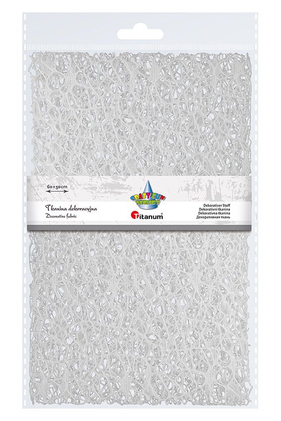 Arkusz miękkiej siatki dekoracyjnej z syntetycznych nici. Zastosowanie: florystyka (dekoracja bukietów, kompozycji kwiatowych, stroików), pakowanie prezentów (także jako wypełnienie pudełek prezentowych), dekoracja sal na przyjęcia, ozdabianie stołów. Wymiary: 60 x 50 cm, biała.
