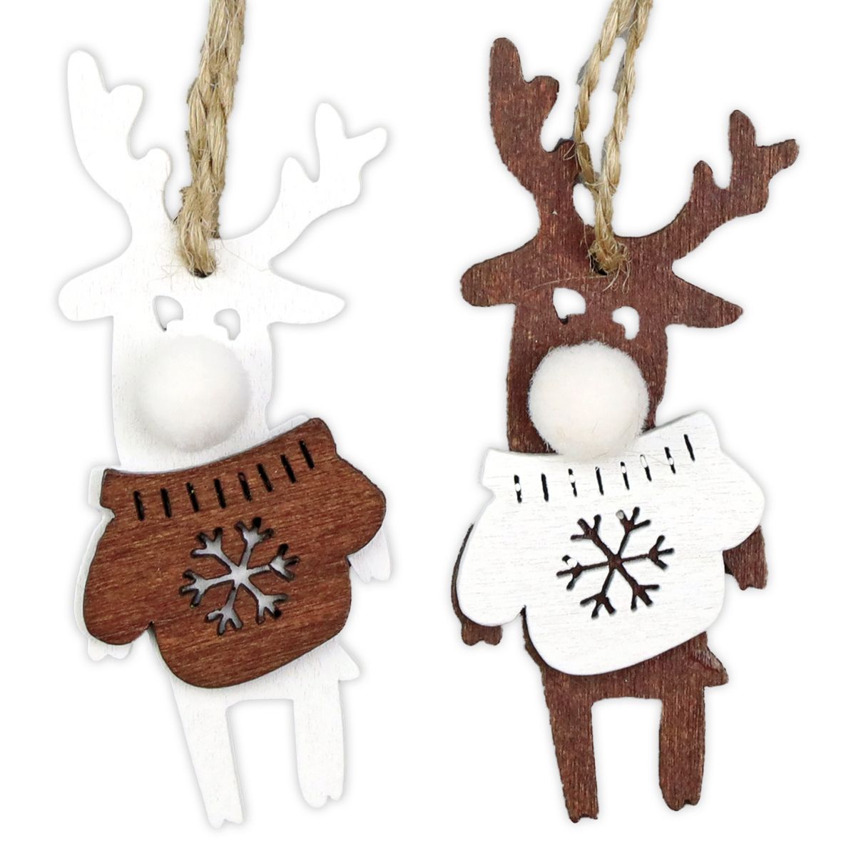 Zawieszki drewniane, wzór: renifery w sweterkach, nosy z pomponów, wymiary: 40 x 75 mm, 2 wzory: biało-brązowe, brązowo-białe. 6 sztuk.