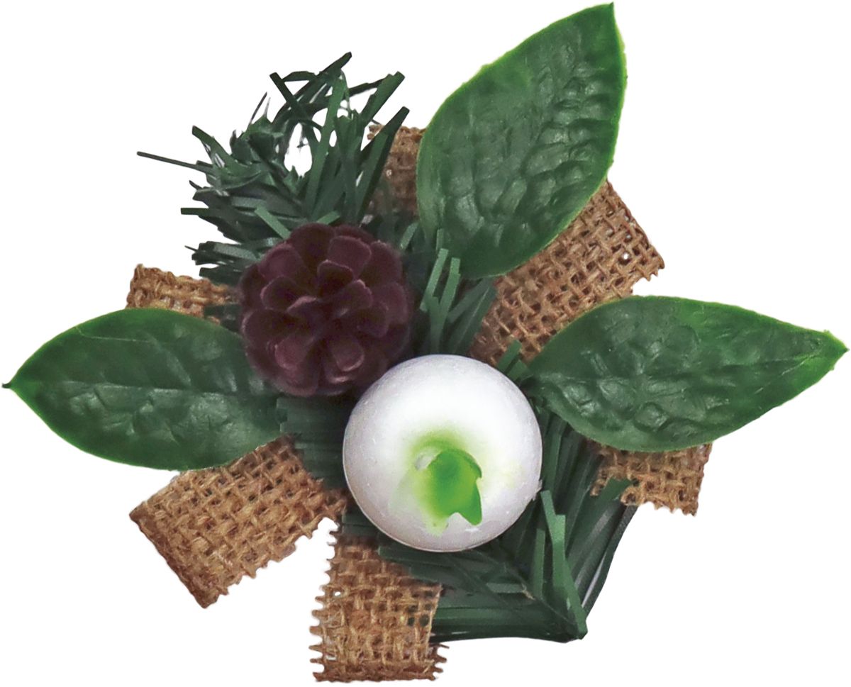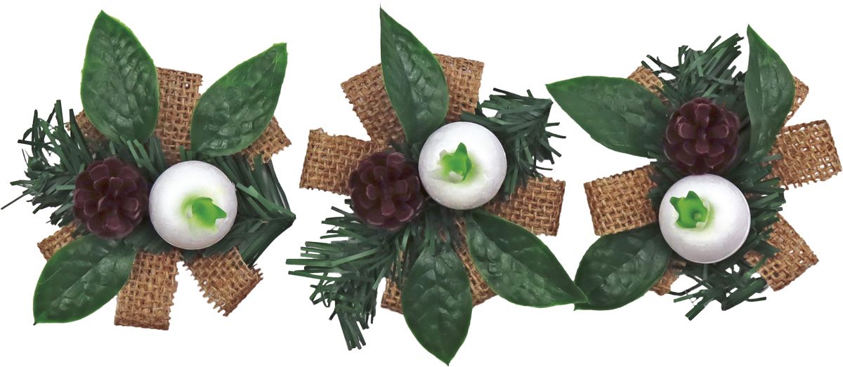 Stroiki świąteczne 10cm na jutowej wstążce z szyszką, listkami i białą styropianową bombką. 3 sztuki.