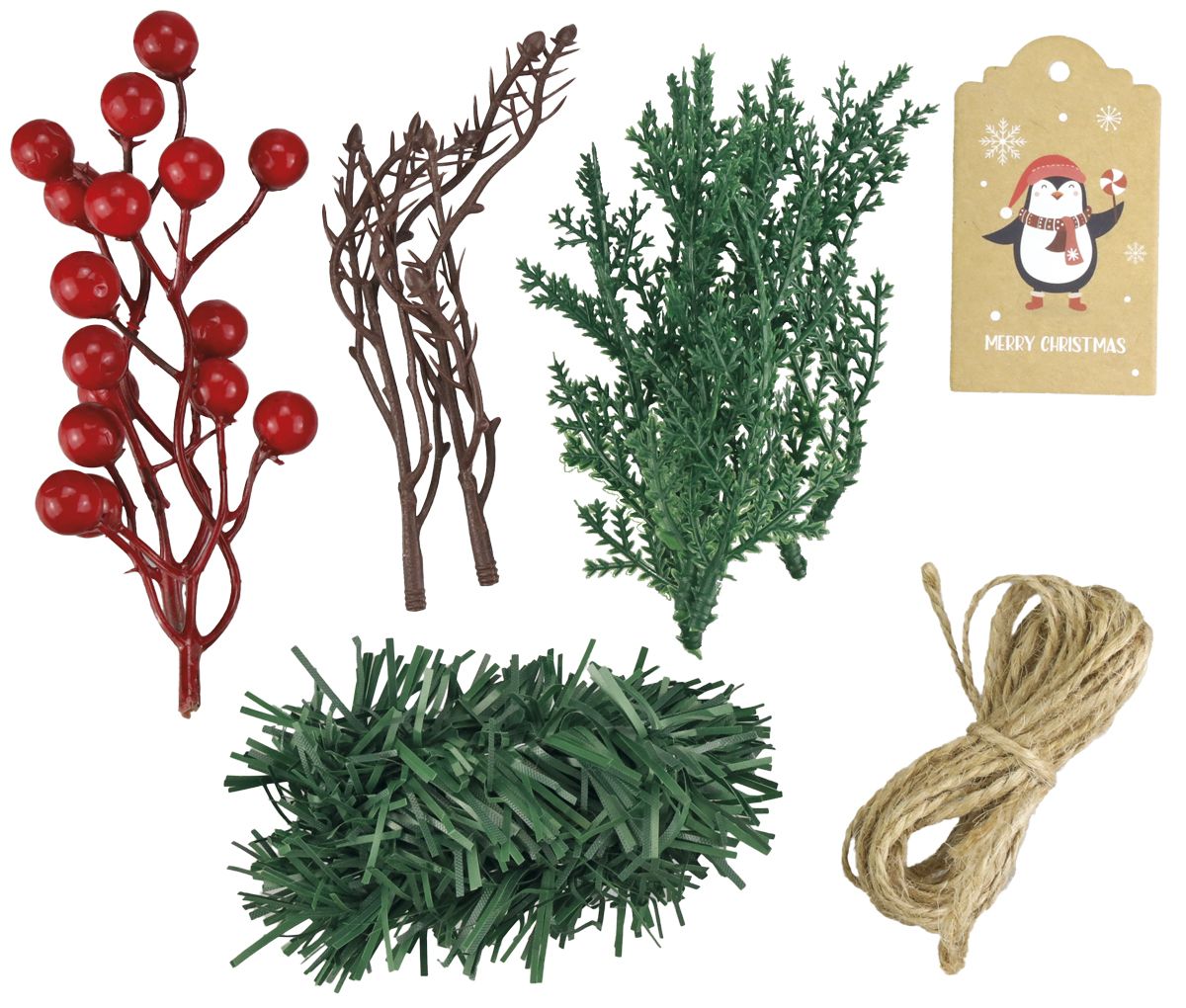 Zestaw do dekoracji prezentu, zawiera: girlandę plastikową o długości 45 cm, gałązki żywotnika 6 szt., gałązki jarzębiny 2 szt., suche gałązki 2 szt., sznurek jutowy o długości ok. 3 m, zawieszkę prezentową 40x70 mm.
