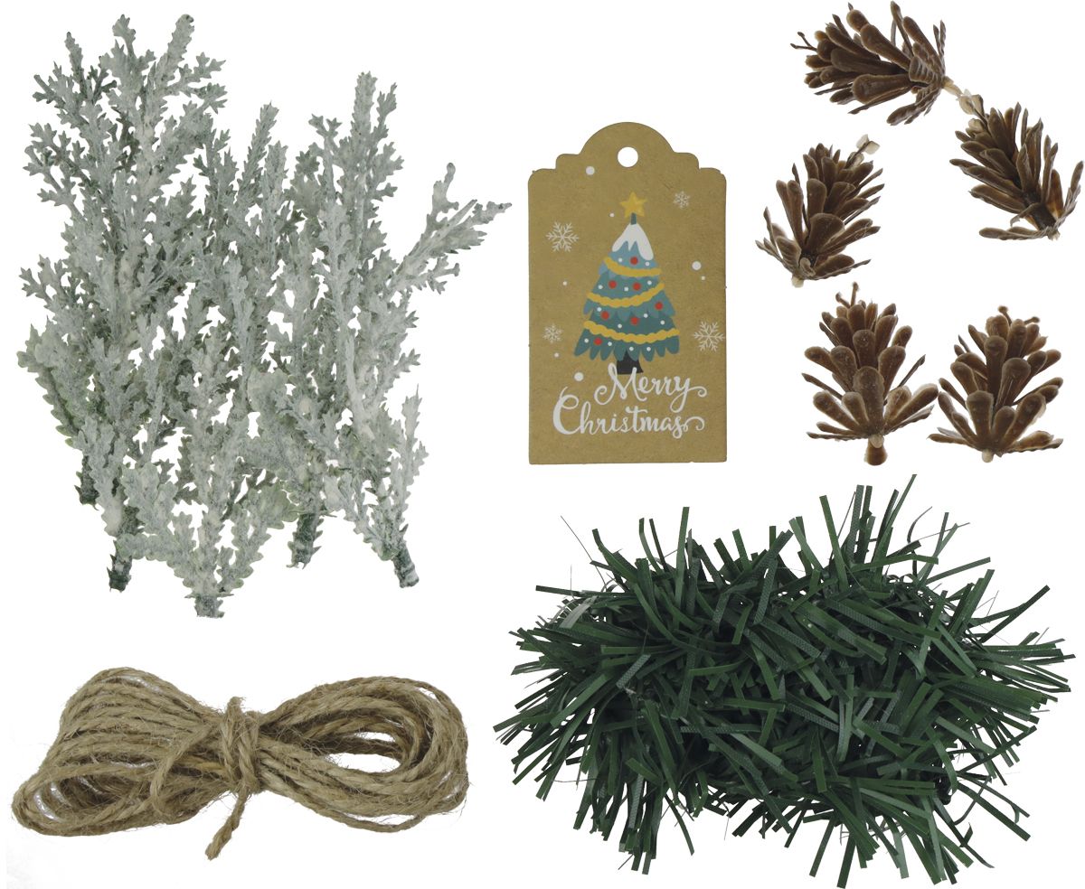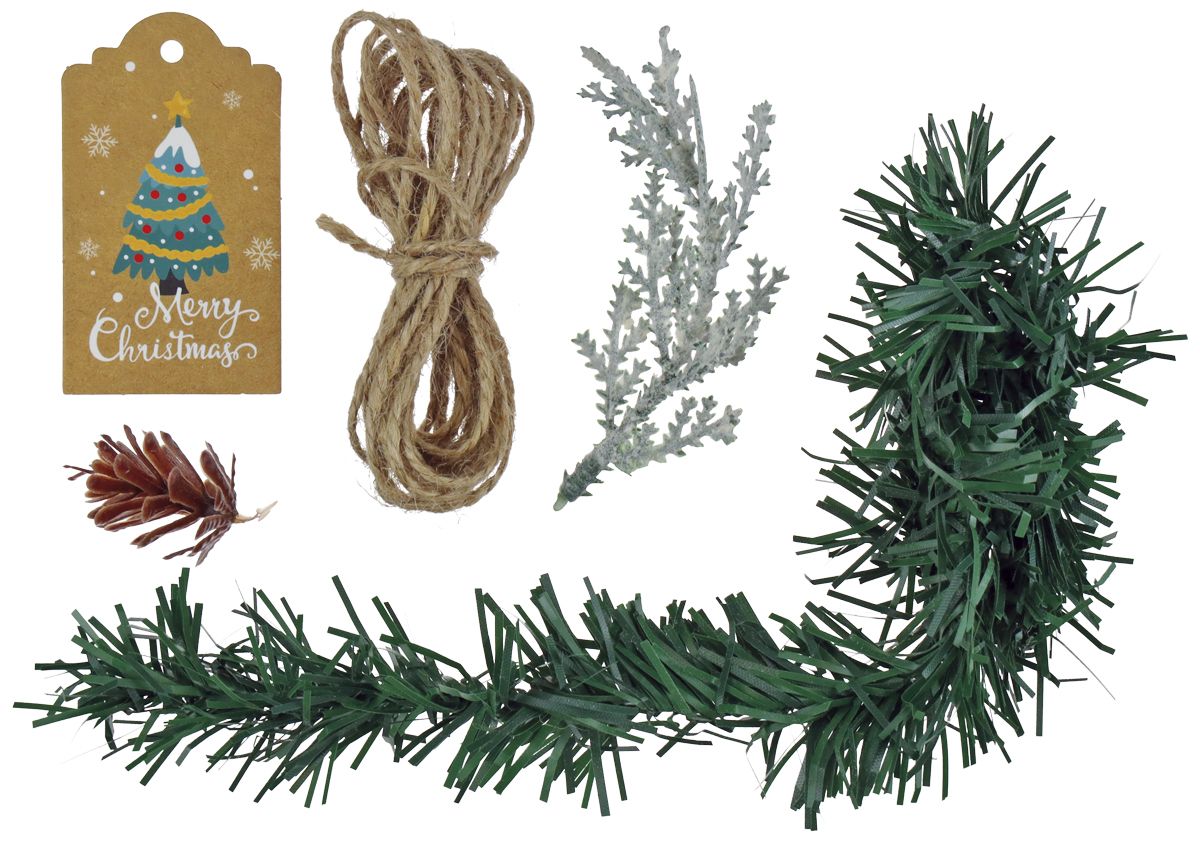 Zestaw do dekoracji prezentu, zawiera: girlandę plastikową o długości 45cm, gałązki żywotnika ośnieżone 6 szt., szyszki plastikowe 25x32mm 5szt., sznurek jutowy o długości ok. 3 m, zawieszkę prezentową 40x70 mm.