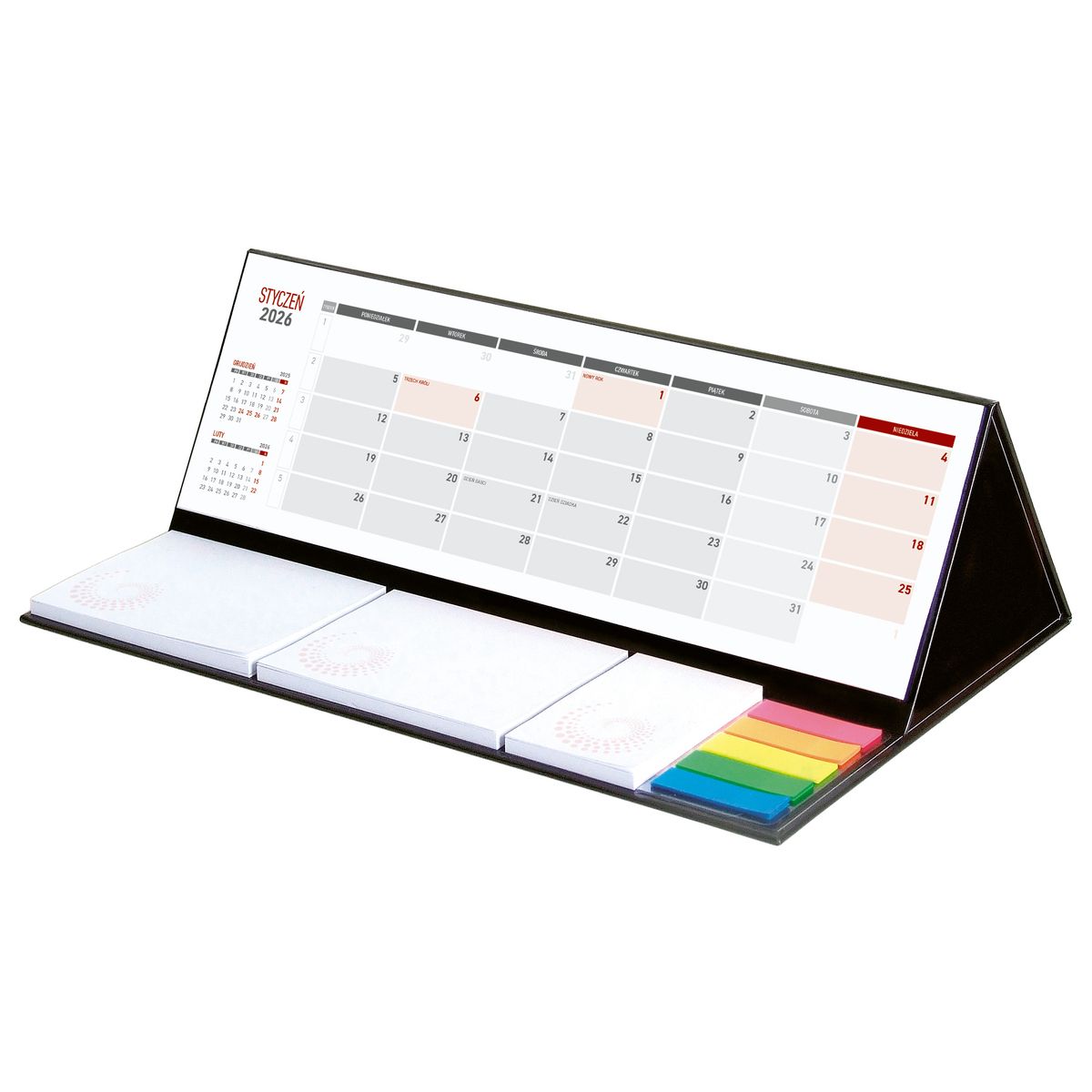 Wygodny kalendarz stojący na biurko z przejrzystym kalendarium w układzie trójdzielnym z poręcznymi karteczkami samoprzylepnymi do notowania. Przydatny zwłaszcza w biurze. W kalendarzu zaznaczono święta i daty imienin. Na tylnej części kalendarza istnieje możliwość wykonania nadruku reklamowego na obszarze o wymiarach 305 x 100 mm.