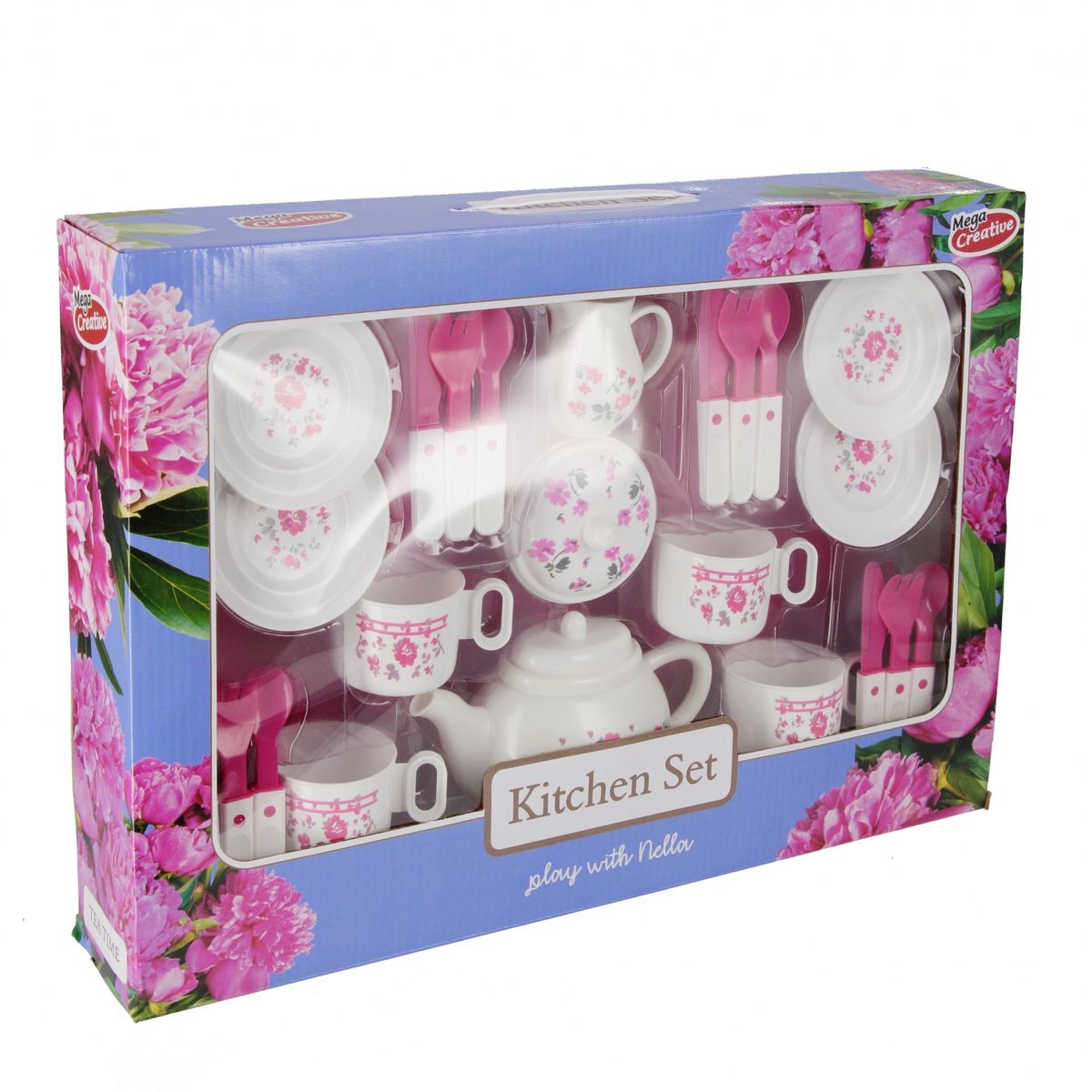 Zalety produktu: Naczynia kuchenne Nella MEGA CREATIVE doskonale sprawdzą się podczas zabawy w przygotowywanie pysznej herbatki, kawki, ciast, ciasteczek. Tak bogate wyposażenie zestawu może sprawić, że zabawa przerodzi się w prawdziwą ucztę i mile spotkanie przy herbatce, kawce Zawartość zestawu: 4x talerzyk, 4x kubeczek, 1x czajniczek na herbatę/kawę, 1x dzbanek na mleko, 1x cukierniczka, 3x kpl sztućców. Wszystkie elementy wykonano z plastiku. Wymiary/waga/baterie: wymiary produktu (dł. x wys. x gł.)[cm]: czajnik na kawę 17x10x9, waga produktu bez opakowania [kg]: 0,25 kg, wymiary opakowania (dł. x wys. x gł.)[cm]: 46x32x8, , waga produktu w opakowaniu (kg.) 0,45 kg, Nie wymaga zasilania bateriami. Zabawka przeznaczona dla dzieci w wieku: 3+. Pakowany w kartonik z okienkiem W kartonie zbiorczym po 9/18szt.
