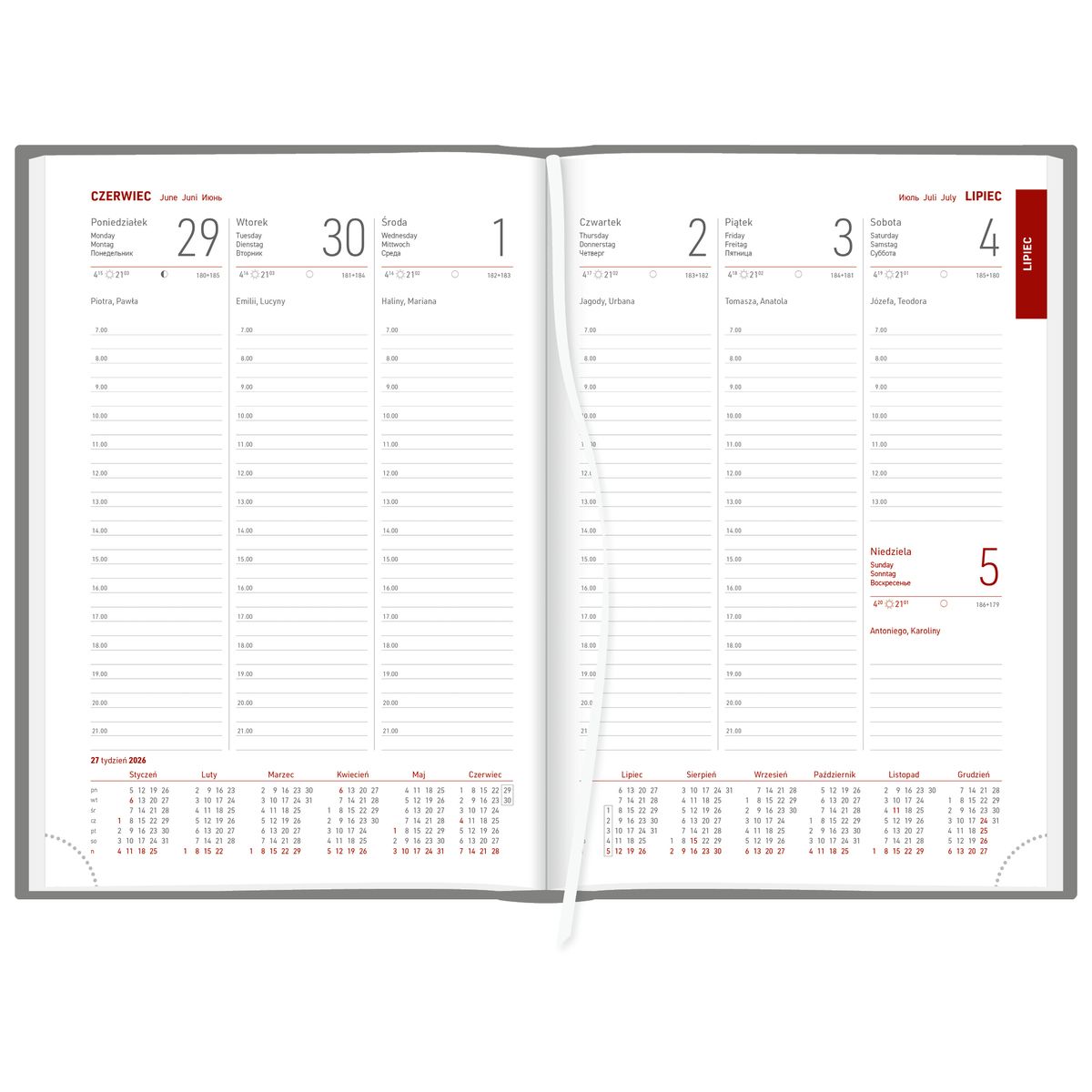 KALENDARZ ZAWIERA: • kalendarium w językach: PL, GB, D, F, RUS • fazy Księżyca, wschody i zachody Słońca • podwójne imieniny