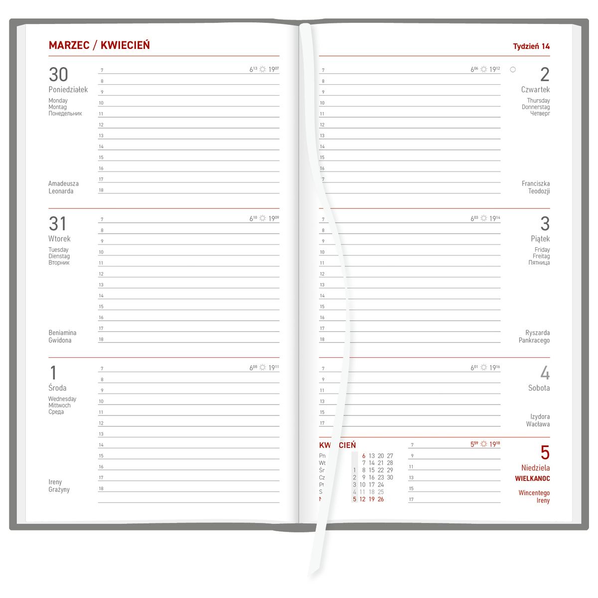 Kalendarz drukowany na białym papierze; bloki terminarza szyte nićmi; kapitałka i tasiemka białe; przejrzysty układ graficzny kalendarium