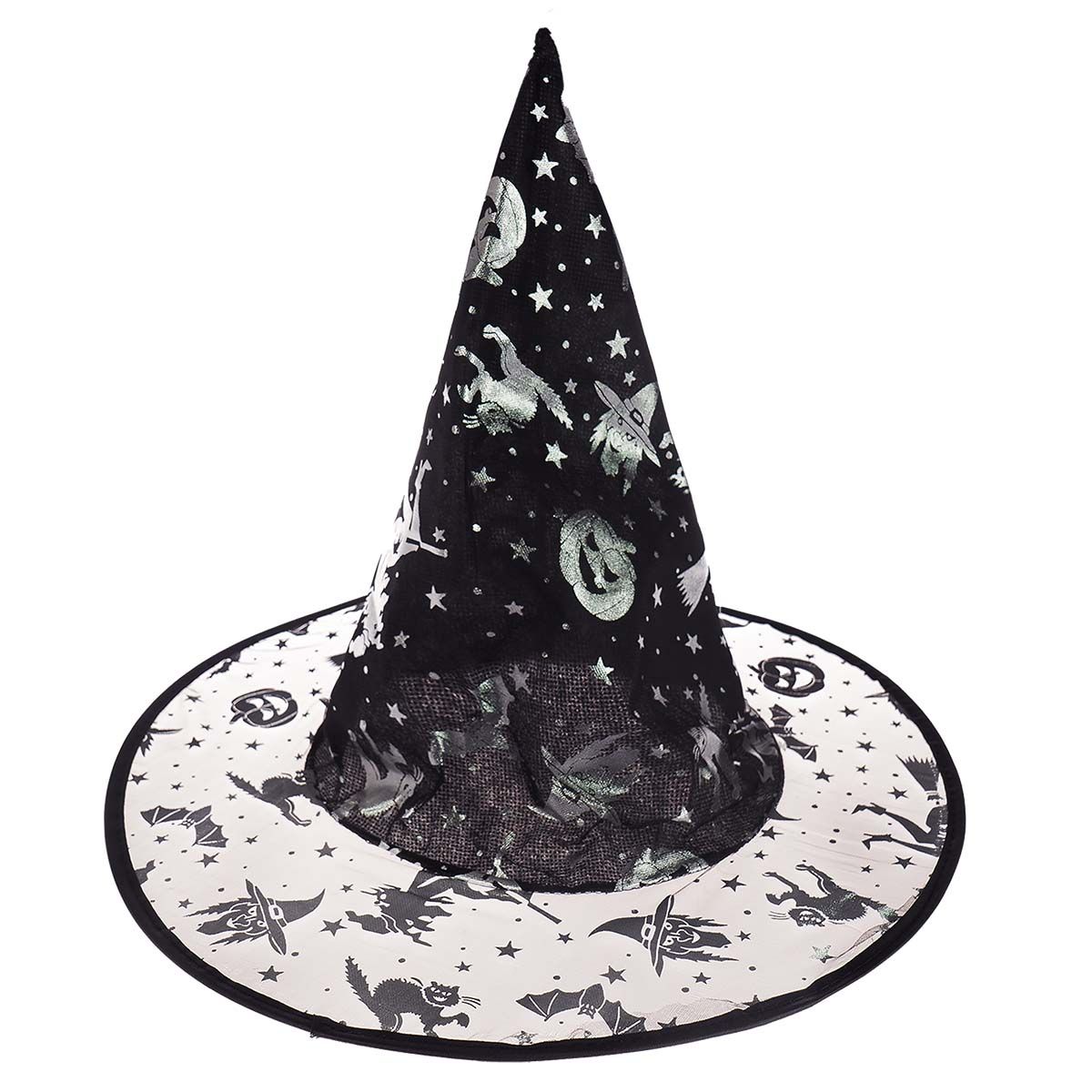Stylowy kapelusz czarownicy z szerokim, transparentnym rondem i dekoracyjnym nadrukiem to idealny dodatek do halloweenowych przebieranek. Kapelusz wykonany jest z lekkiego, lekko usztywnianego materiału na rondzie, dzięki czemu zachowuje kształt i dobrze prezentuje się na głowie.