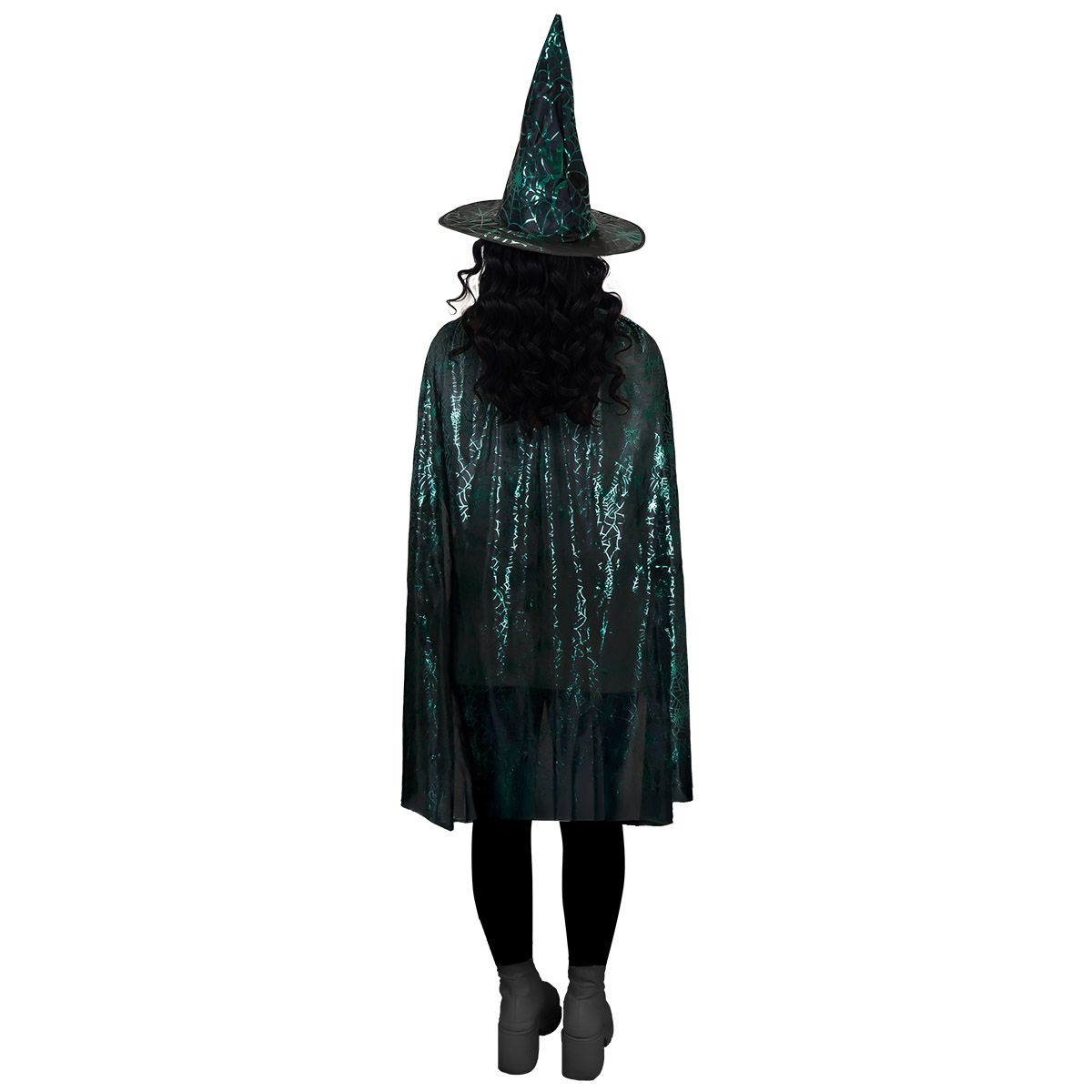 Zestaw czarownika to idealna propozycja na Halloween, bal przebierańców, imprezy tematyczne lub spektakle. Składa się z długiej peleryny oraz klasycznego kapelusza z szerokim rondem, oba elementy wykonane z czarnego, lekko transparentnego materiału ozdobionego metaliczno-brokatowym nadrukiem pajęczyn i pająków w kolorze zielonym z efektem połysku.