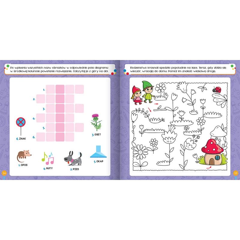 Książeczka z urozmaiconymi łamigłówkami dostosowanymi do możliwości 5-letniego dziecka przyniesie małemu czytelnikowi radość z dobrej zabawy i satysfakcję z samodzielnie wykonanych zadań. Krzyżówki, labirynty, łączenia punktów, ukryte hasła i obrazki oraz inne łamigłówki będą znakomitym treningiem logicznego myślenia, a atrakcyjna szata graficzna dodatkowo zwiększy przyjemność korzystania z książki.