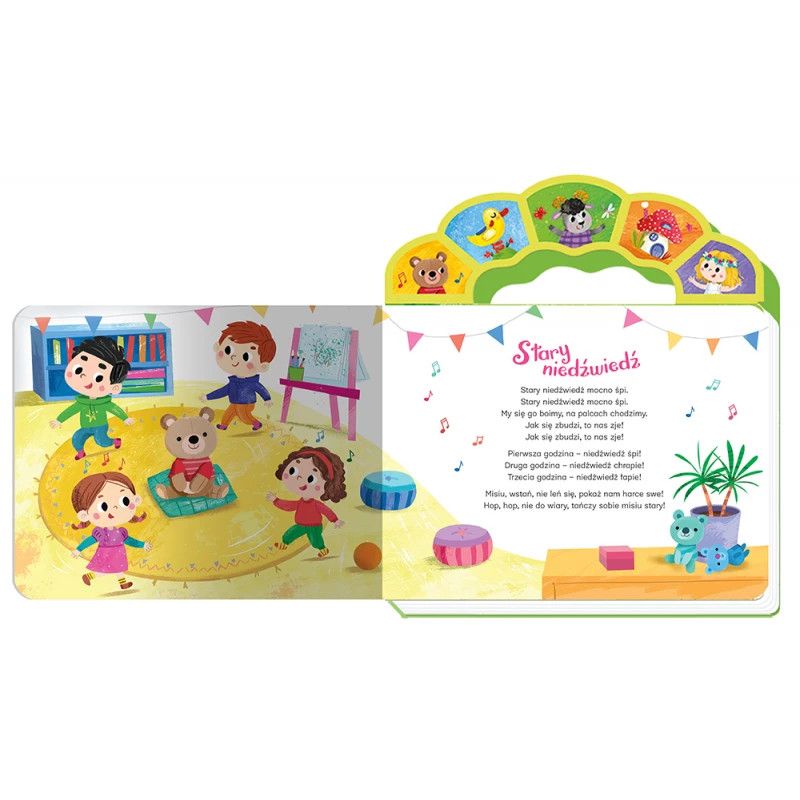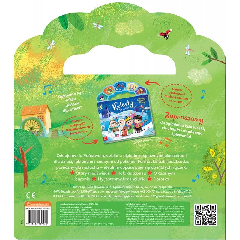 Oddajemy do Państwa rąk zbiór z pięknie zaśpiewnymi piosenkami dla dzieci, lubianymi i znanymi od pokoleń. Format książki jest bardzo poręczny dla malucha – idealnie dopasowuje się do małych rączek. Kolorowe ilustracje oraz teksty każdej z piosenek zachęcą dziecko do wspólnego śpiewania. Teksty otoczone są kolorowymi ilustracjami, nawiązującymi do treści piosenek, często je uzupełniają, a co najważniejsze – zachęcają do wspólnej zabawy. Piosenkę można włączyć, naciskając obrazek na rączce – jeden obrazek odpowiada jednej piosence. W każdej chwili można wyłączyć grającą melodię, ponownie naciskając obrazek. Książka działa na baterie, które można wyjąć i wymienić. Istnieje również możliwość wyłączenia grających piosenek, przesuwając guzik przy baterii. Książka sprawdzi się dla dzieci w każdym wieku. Młodsze mogą tylko słuchać piosenek, starsze dzieci mogą przeczytać tekst i śpiewać równocześnie z nagraniem. W zbiorze znajduje się pięć popularnych piosenek wraz z nagraniami: Stary niedźwiedź, Koła autobusu, O czarnym baranie, My jesteśmy krasnoludki, Dorotka. Piosenki, które znają wszyscy, nagrania, które nigdy nie ulecą z pamięci. Książeczki z nagraniami – doskonałe do słuchania i śpiewania! Rok wydania: 2025 Przedział wiekowy: 0-3 lat Oprawa: twarda Format: 23 x 26 cm, moduł dźwiękowy z 5 piosenkami ISBN: 978-83-8213-953-2 EAN: 9788382139532 Stron: 10 Redakcja: Anna Podgórska Producent: Wydawnictwo Aksjomat sp. z o.o, ul. Lindego 7C, 30-148 Kraków, e-mail : marketing@aksjomat.com, tel.12 633 70 22 Produkt ma ZNAK CE, Kraj pochodzenia: Chiny OSTRZEŻENIE! Nieodpowiednie dla dzieci poniżej 3 lat. Książka zawiera drobne elementy. Ryzyko zadławienia. Do zabawy pod nadzorem osoby dorosłej. Uwaga! Produkt zawiera baterie i części elektroniczne, które mogą być szkodliwe dla środowiska. Nie należy go łączyć z odpadkami komunalnymi. Wymaga składowania w specjalnie wyznaczonych punktach. Moduł dźwiękowy zawiera 3 baterie AG13/LR44. Zasady użytkowania książki dźwiękowej: - Chroń moduł dźwiękowy przed wilgocią i wysokimi temperaturami. - Nie używaj substancji chemicznych do czyszczenia modułu dźwiękowego. - Nie wkładaj jednocześnie do modułu dźwiękowego baterii różnego rodzaju. - Usuwaj z modułu dźwiękowego zużyte baterie i wyrzucaj je do specjalnie przeznaczonych do tego pojemników. - Nie korzystaj z ładowalnych baterii. - Wymiana baterii może być dokonywana jedynie przez osoby dorosłe. Instrukcja wymiany baterii: Odkręć śrubkę modułu dźwiękowego i zdejmij pokrywę. Wyjmij baterie. Umieść je poza zasięgiem dzieci, a następnie oddaj do punktu zbiórki zużytych baterii. Włóż nowe baterie, zamknij pokrywę i ponownie ją przykręć.