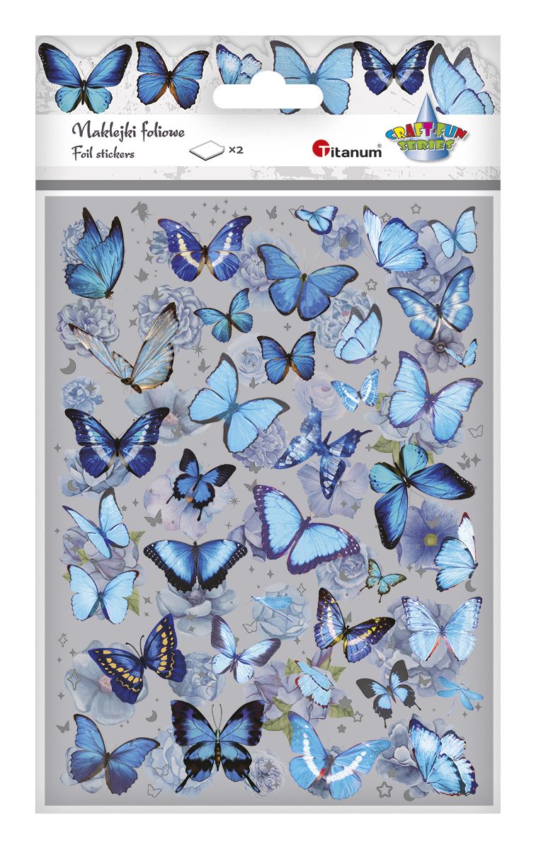 Naklejki foliowe, 2 plansze, wzory: motyle, kwiaty, tonacja niebieska.