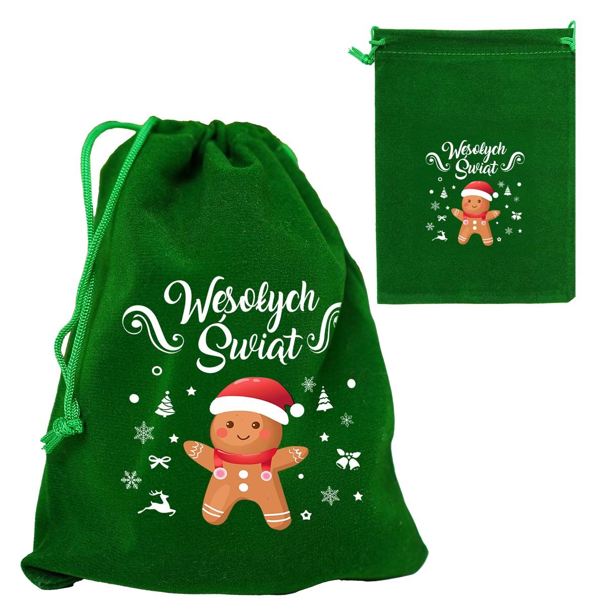 Woreczek welurowy z napisem „Weosłych Świąt” to praktyczny i estetyczny dodatek, który idealnie sprawdzi się w okresie świątecznym. Wykonany z miękkiego materiału w zielonym kolorze, ozdobiony nadrukiem z uroczą postacią pierniczka, będzie świetnym opakowaniem na drobne upominki lub dekoracyjne akcesoria. Dzięki ściągaczowi woreczek łatwo się zamyka, a jego zawartość pozostaje bezpieczna.