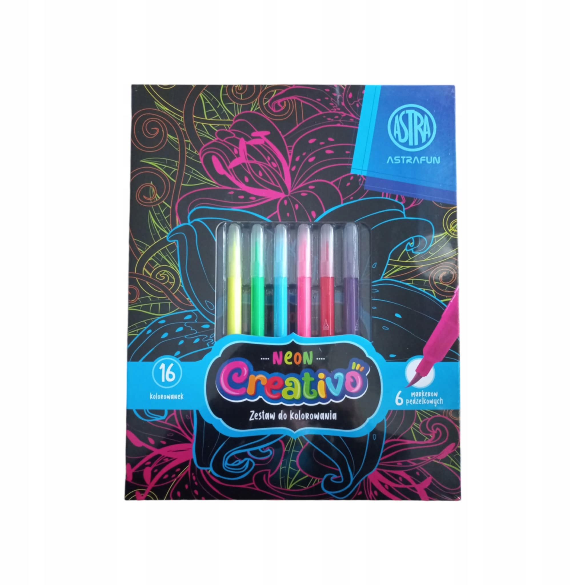 Zestaw do kolorowania Astra Creativo Neon zawiera 6 kolorowych markerów oraz blok z 16 kolorowankami