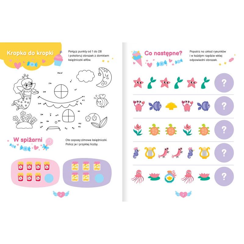Księżniczki zapraszają do świata zadań z naklejkami. Ciekawe i starannie opracowane łamigłówki z naklejkami rozwijają spostrzegawczość, w naturalny sposób zachęcają do nauki liczenia, uczą skupienia i koncentracji uwagi. Dzieci bardzo lubią takie aktywizujące zadania. Znajdą tu klasyczne labirynty, wyszukiwanie różnic, łączenie punktów, ukryte rysunki, logiczne sekwencje i obrazkowe sudoku oraz ćwiczenia manualne w rysowaniu po śladzie. Dodatkowe naklejki 3D można wykorzystać w książce lub poza nią.