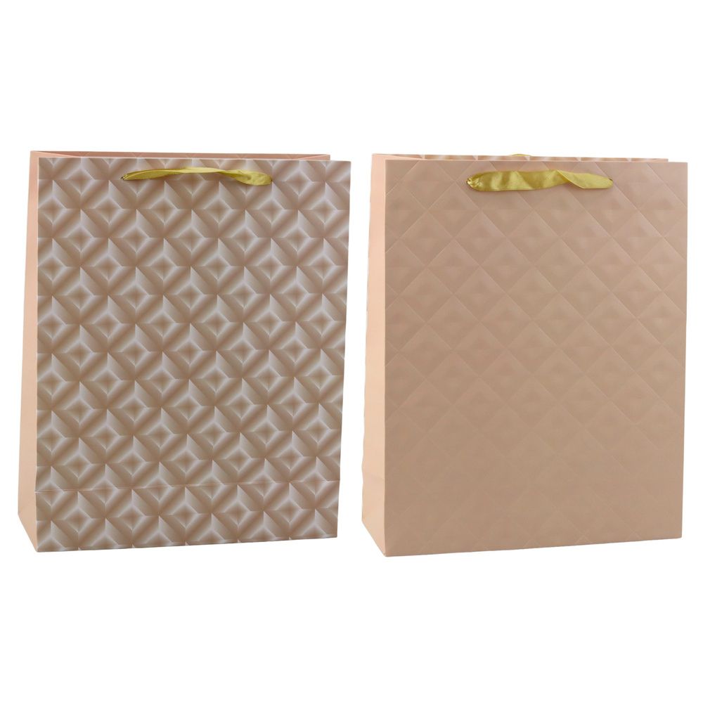 Torba została wykonana z wysokiej jakości, usztywnionego papieru, a jej powierzchnia zdobiona jest tłoczonym geometrycznym wzorem, który pięknie odbija światło. Dwa warianty przodu i tyłu sprawiają, że torba prezentuje się wyjątkowo stylowo z każdej strony. Satynowe uchwyty w jasnym odcieniu nadają całości subtelnego charakteru i zapewniają komfort przenoszenia.