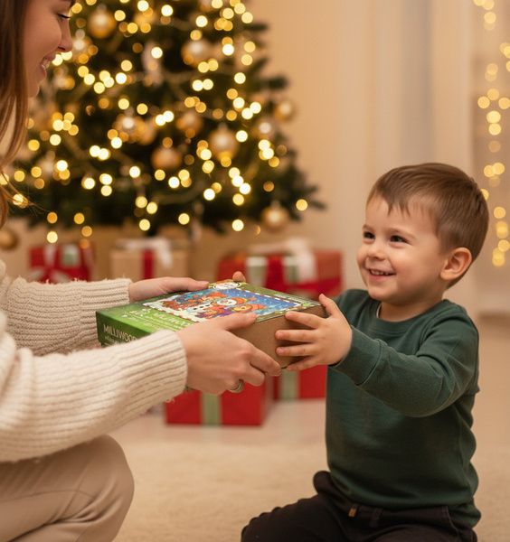 Pełne radości zimowe spotkanie z bałwankiem to ilustracja, która od razu wprowadza w świąteczny nastrój. Wesoła rodzina, uśmiechnięty bałwanek i towarzyszące im zwierzaki tworzą obrazek idealny na zimowe wieczory spędzane wspólnie przy stole.